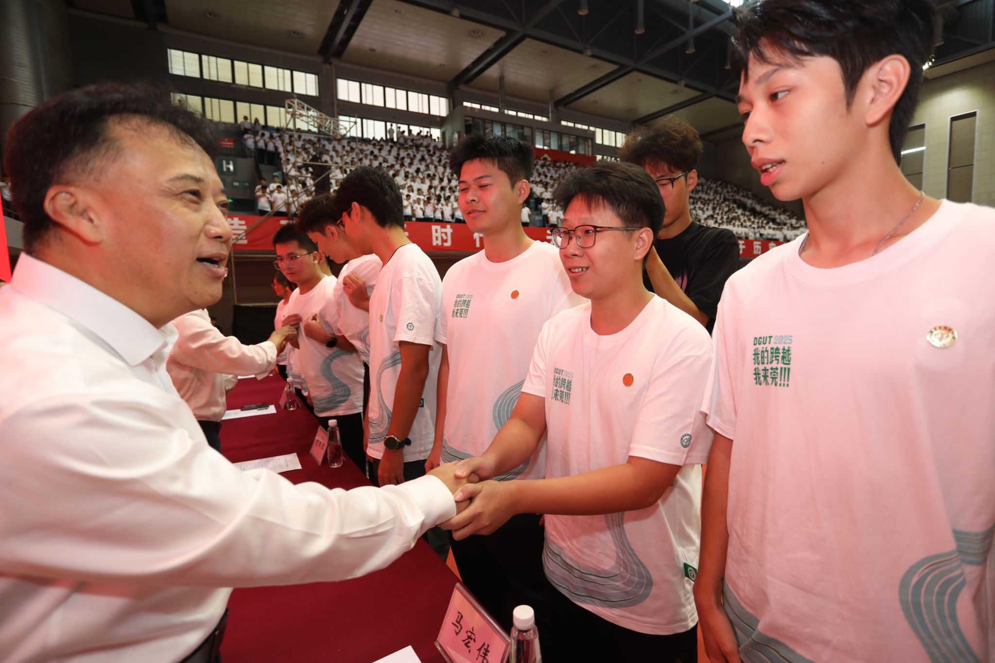 随后,在全场人员的见证下,主席台前排领导为新生代表佩戴校徽,全体新生同时集体戴上校徽。一枚枚校徽闪耀胸前,标志着同学们正式加入莞工大家庭,成为了“莞工人”,开启属于自己的青春跨越之旅。