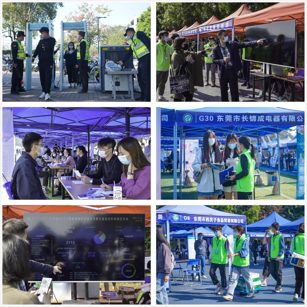 12月10日上午,广东省2022届普通高校毕业生供需见面活动(东莞地区专场)在我校松山湖校区假草田径场举行。今年学校高度重视招聘会组织和防疫工作,除了按疫情防控要求严格审核进校人员外,还在招聘会主入场处专设带红外测温功能安检门及X光机,并专聘30名安保公司人员维持场内外秩序。在活动现场设置了医疗服务点和应急观察点,配备口罩、免洗手液、体温枪等防疫用品。